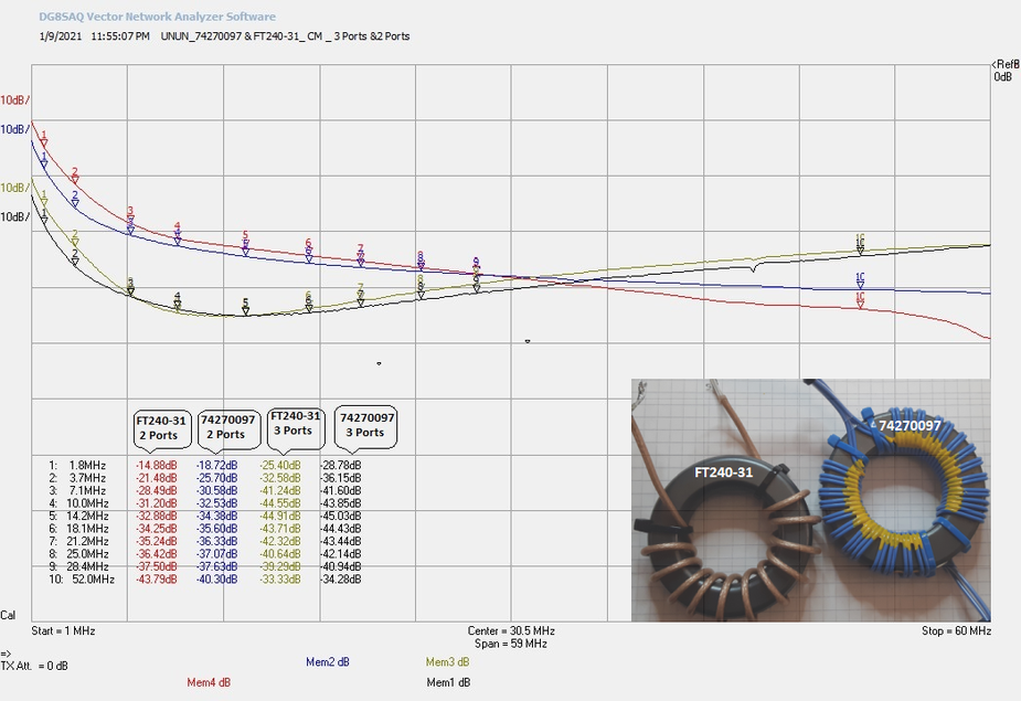 FT240-31 este bobinat cu 14 spire CuAg (2x14 spire) iar torul de la Wuerth este bobinat cu 12 spire RG188.